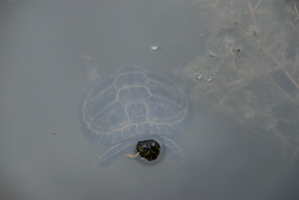 A turtle in the pond. The ponds in Chinese Gardens are intentionally cloudy to intensify the reflections.
