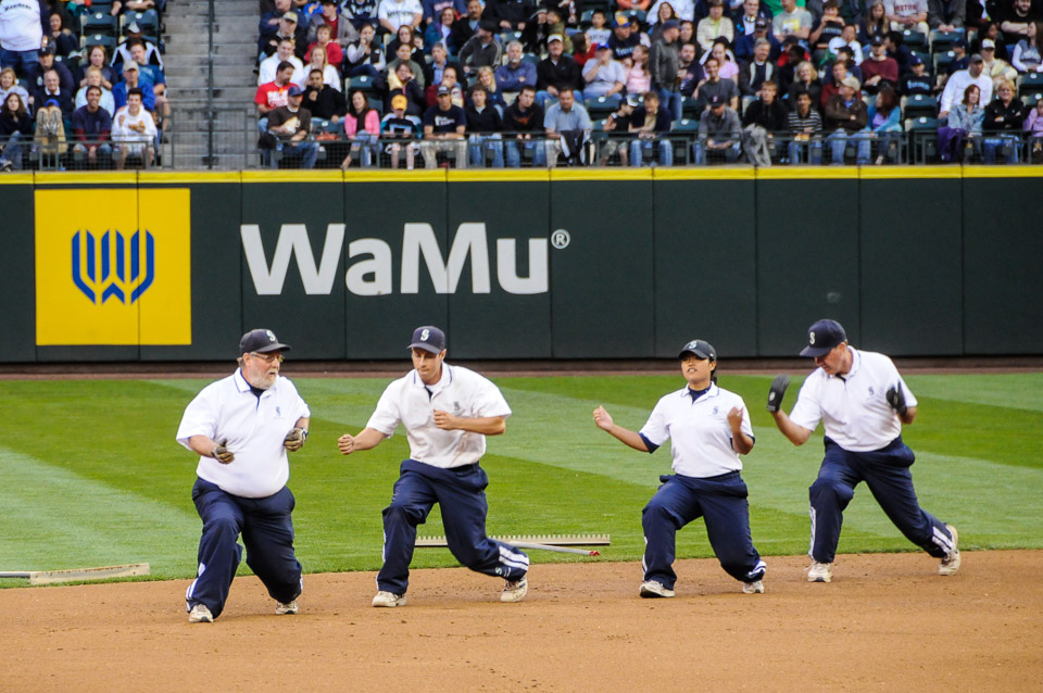 The Grounds Crew dancing between innings