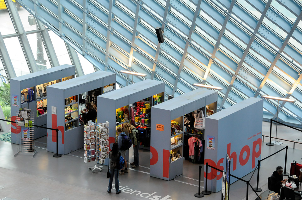 The gift shop is collapsed into a locked cube when it is closed (see the rails on the floor).