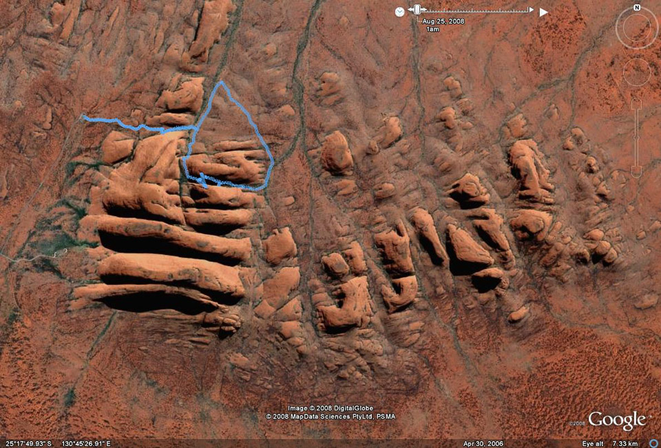 The GPS track ( in blue, 8.5 km/5.3 m) of our Valley of the Winds walk at Kata Tjuta superimposed on a Google Earth map