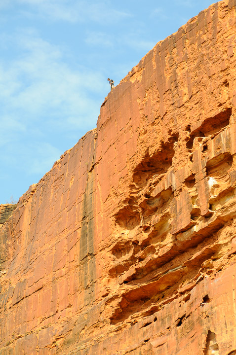 A view from the bottom of the Canyon. Yes, that's a person at the top of the cliff!