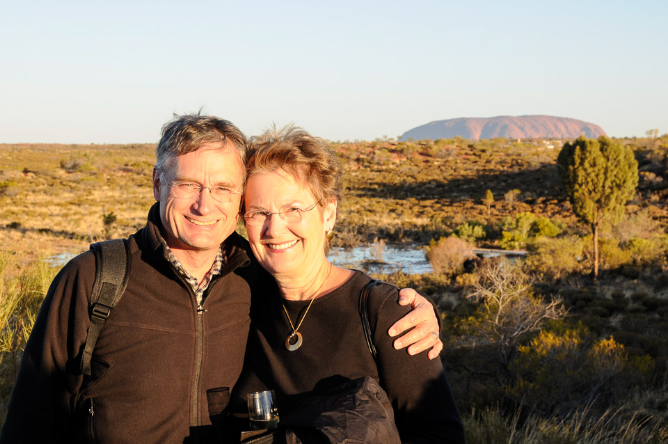 Doug and Kathy enjoying sparkling wine during sunset at Uluru