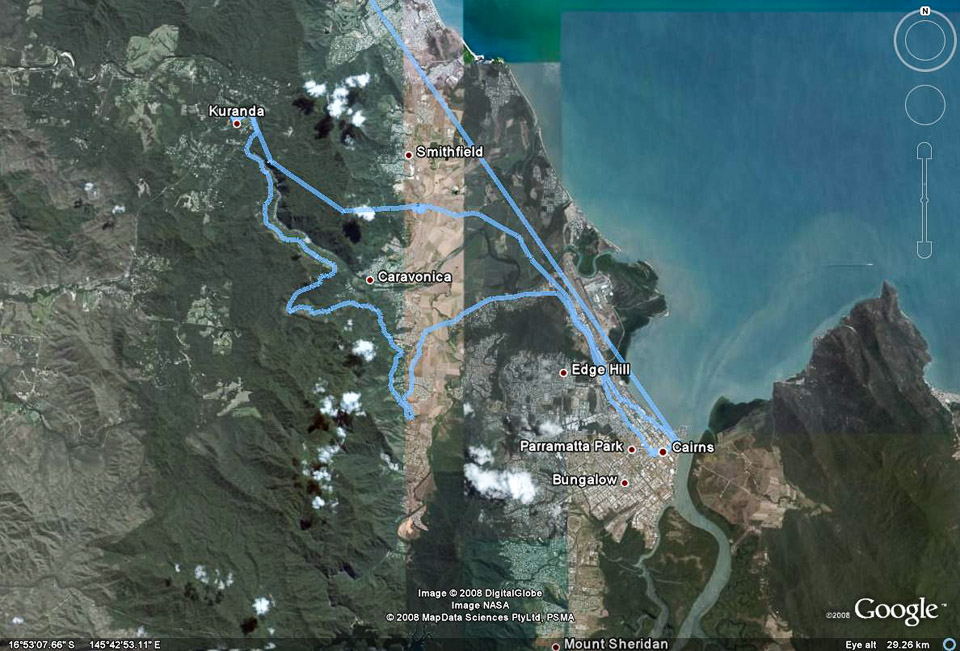 Our GPS track from Cairns to Kuranda and back superimposed on a Google Earth map.