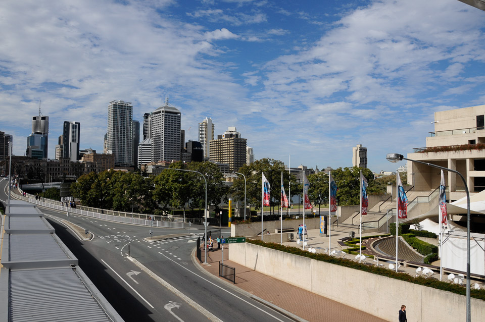Looking across a bridge toward the Brisbane CBD from South Bank