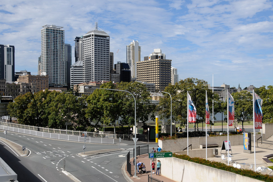 Looking across a bridge toward the Brisbane CBD from South Bank