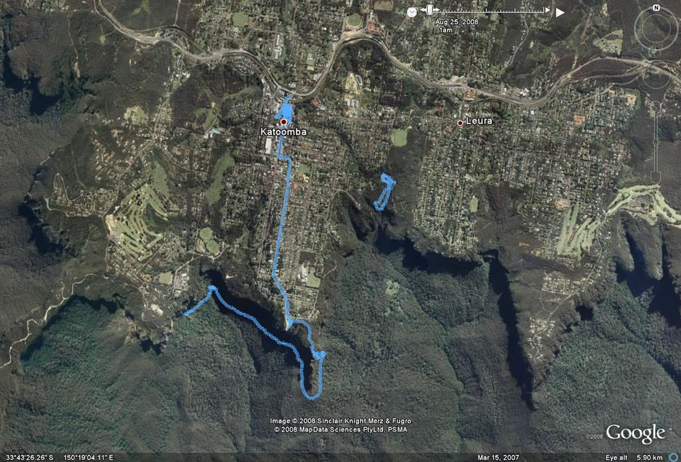 The GPS tracks (in blue, 8 km/5 m) of our walks in Katoomba and Leura superimposed on a Google Earth map