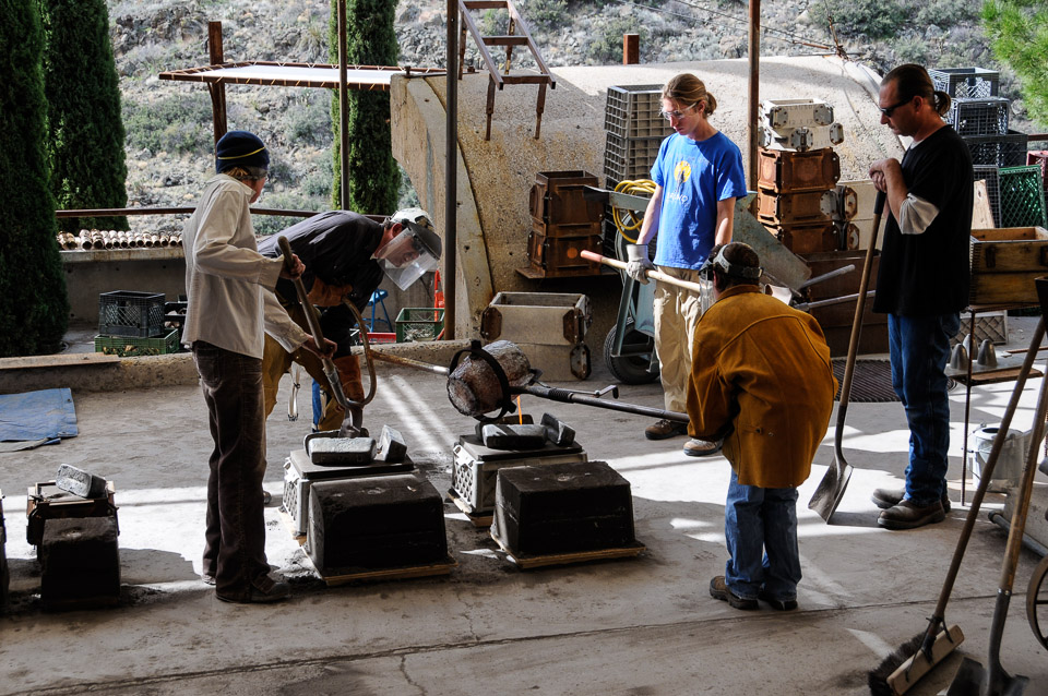 Pouring molten bronze (2200 F) into bell molds at Arcosanti