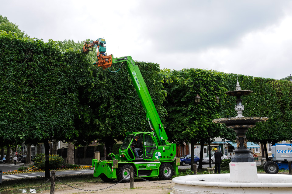 Equipment trimming the tops of linden trees into rectangular hedges