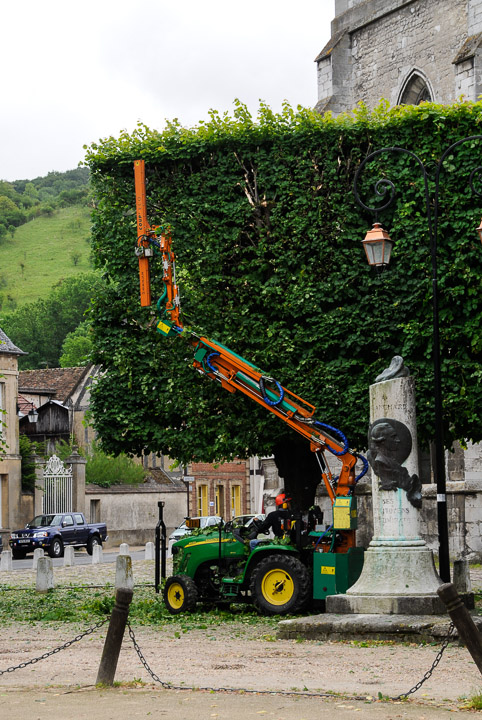 Equipment trimming the sides of linden trees into rectangular hedges