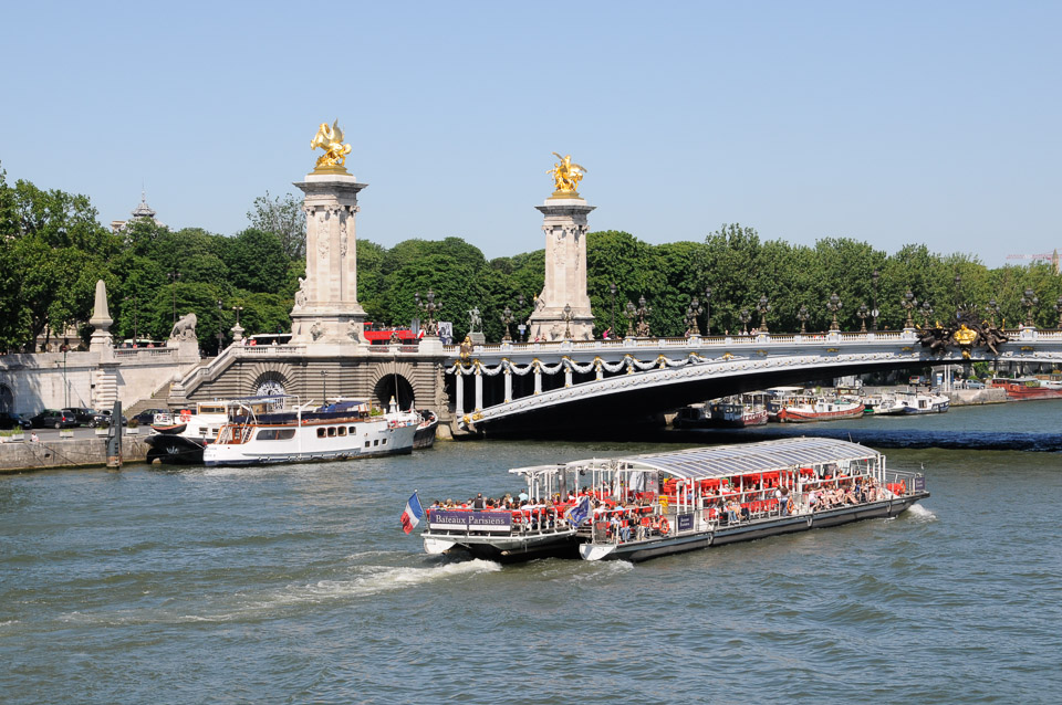 A tour boat on the Seine approaching the Pont Alexandre III