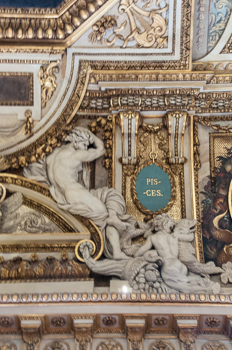 The Apollo Gallery illustrates the ornate decor characteristic of the 18th century French royalty. This is a detail of a ceiling that depicts the signs of the zodiac.