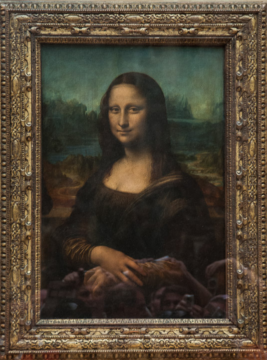 Leonardo da Vinci's Mona Lisa - 1503-1506. It is behind glass, thus the reflections of the mass of humanity viewing and photographing the painting. No one was injured in the taking of this photograph.