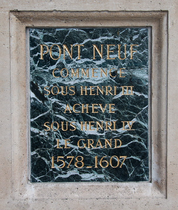 Pont Neuf plaque. Ironically, Pont Neuf or New Bridge is the oldest of the bridges crossing the Seine in Paris.