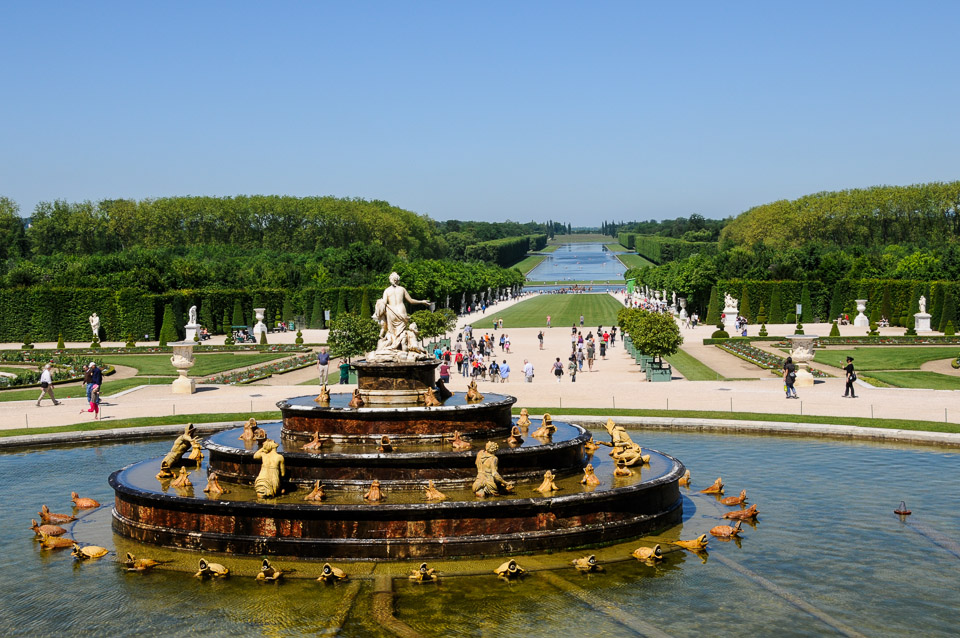 This fountain at Latona Basin tells the story of the birth of Apollo and his sister Diana. It is on the axis of the Royal Drive, which stretches nearly eight miles. The Grand Canal can be seen in the distance.