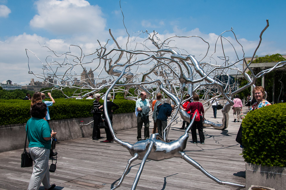 The sculpture, terrace, and New York skyline