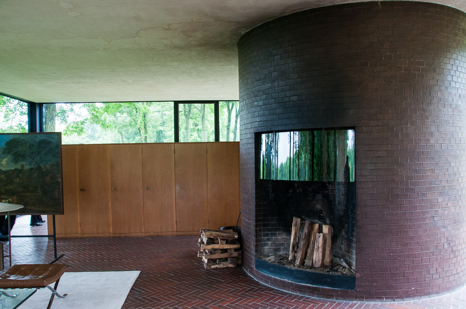 The sitting area and fireplace in the Glass House. The cabinets in the background separate the sitting area from the bedroom.