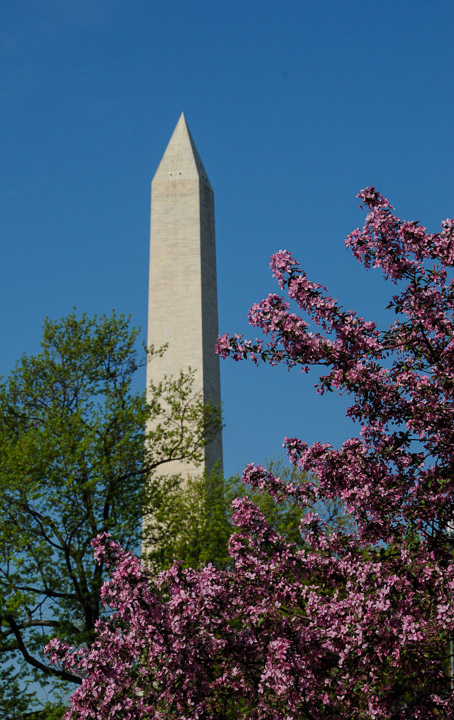 The Washington Monument and cherry blossoms from near the Museum of American History