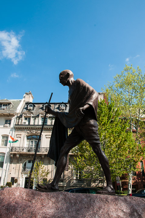 A statue of Ghandi in front of the Indian Embassy, the former Thomas Murray house (1901), an example of Beaux Arts architecture.