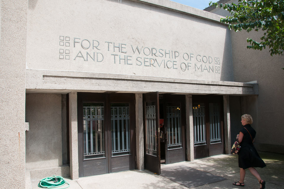 Cheryl Bachand, Tour Leader, enters Unity Temple