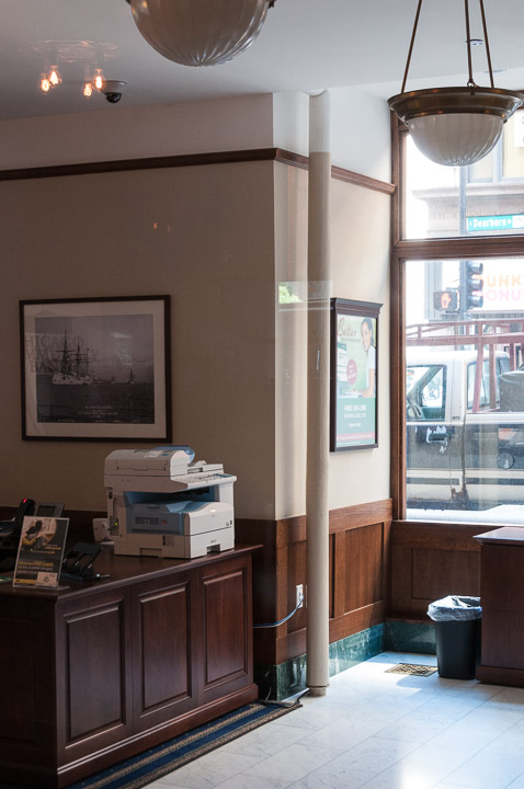 The very thick wall behind the desk (6 feet at ground level) is evidence of the masonry used by Burnham and Root for structural support. Later, Holabird and Roche used steel framing for structural support in the southern half of the building.