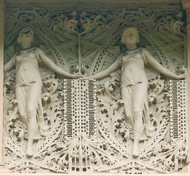 The Heller Maidens, a plaster friese at the top of the house, was created by sculptor Richard Bock.