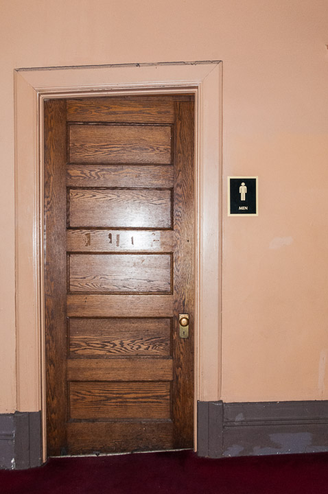 The sloping door to the Men's Room is evidence of the settling of the building's perimeter foundation