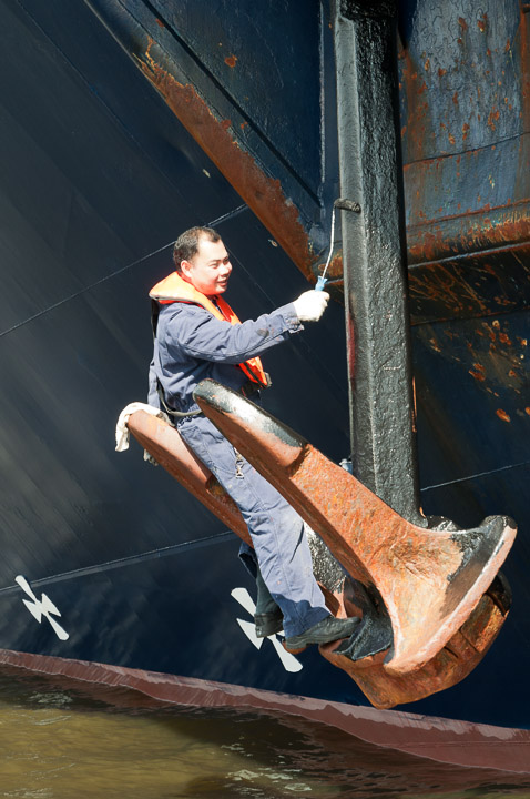 A crew member paints the anchor