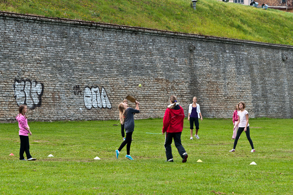 School girls playing a game resembling baseball