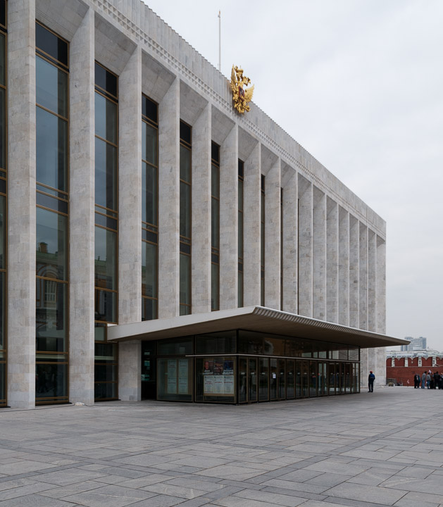 The Kremlin Palace of Congresses was commissioned by Khruschev and was built in 1959-61. It is six stories tall, but three of them are underground so that it does not dominate the historic Kremlin.