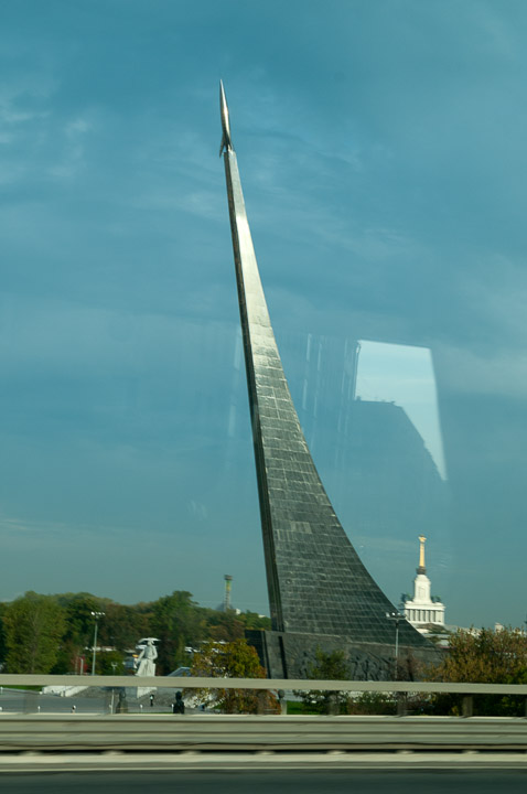 A drive-by photo of a monument to the Conquerors of Space at Russia's Cosmonautics Museum