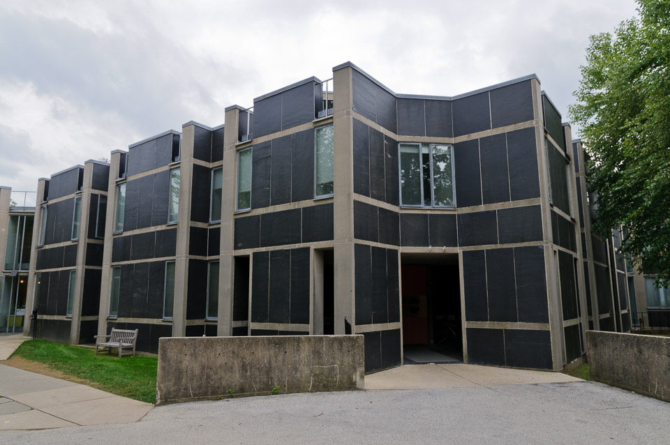 The exterior cladding of the residence hall is slate.