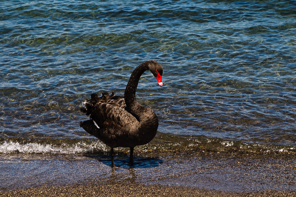 A black swan on the beach at Lake Taupo