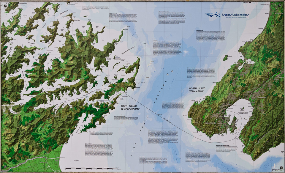 The line crossing Cook Strait is the ferry route from Wellington on the North Island to Picton on the South Island.