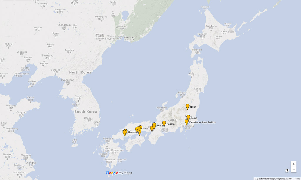 Our travels (yellow pins) and Frank Lloyd Wright's travels (green pins) in Japan