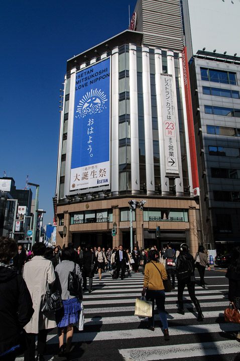 A 'scramble' in Ginza where traffic is stopped in all directions so pedestrians can cross the intersection in any direction, including diagonally