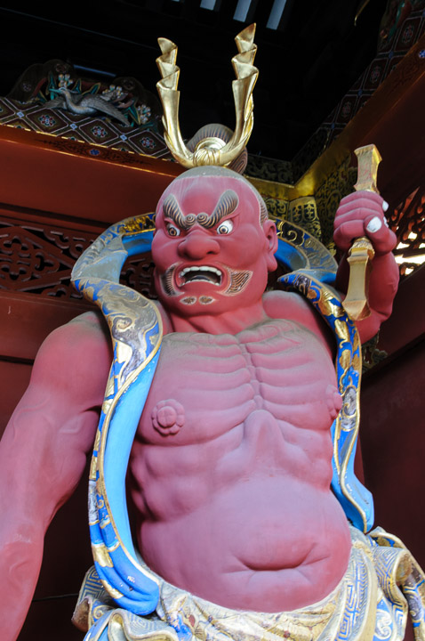 The Nio with his hand down wards off evil spirits. The open mouth can symbolize the beginning (birth) or warding off of evil spirits.