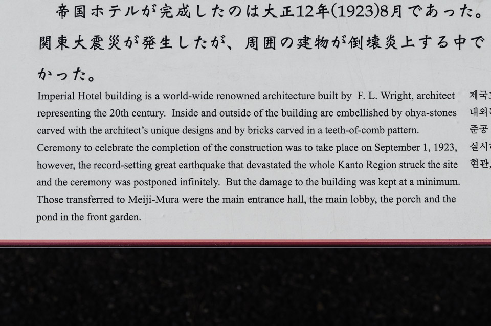 One of the buildings featured at Meiji-Mura is the lobby section of Frank Lloyd Wright's Imperial Hotel.