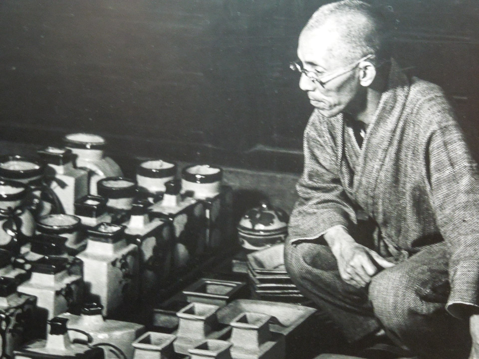 A photograph of Kawai Kanjiro and some of his pottery
