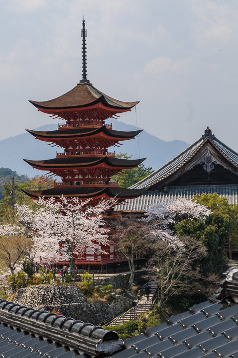 The building to the right of the pagoda is Senjokaku Pavilion, or 'pavilion of the thousand tatami mats', built in 1587.