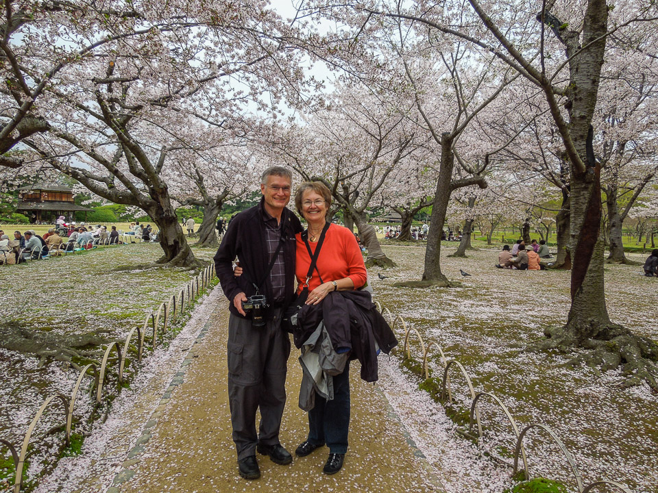 After checking into our ryokan in Kurashiki, we travelled by train the short distance to Okayama to visit Korakuen Garden. We were there during the peak of the cherry blossoms and, thus, were treated to many Japanese picnicking under the trees, artists painting scenes with cherry blossoms, and at least three wedding parties in the garden for photos.