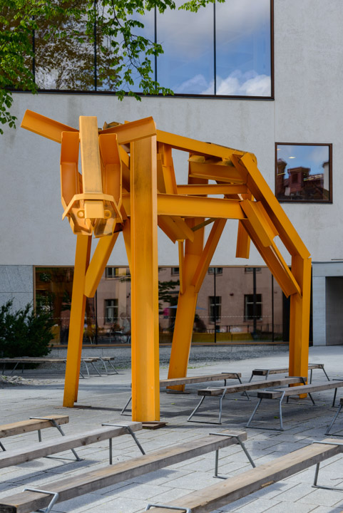 The Turku cow overlooks a courtyard at the center of the offices of the provincial governor, the former governor's residence, the old brick library, and the new main library.