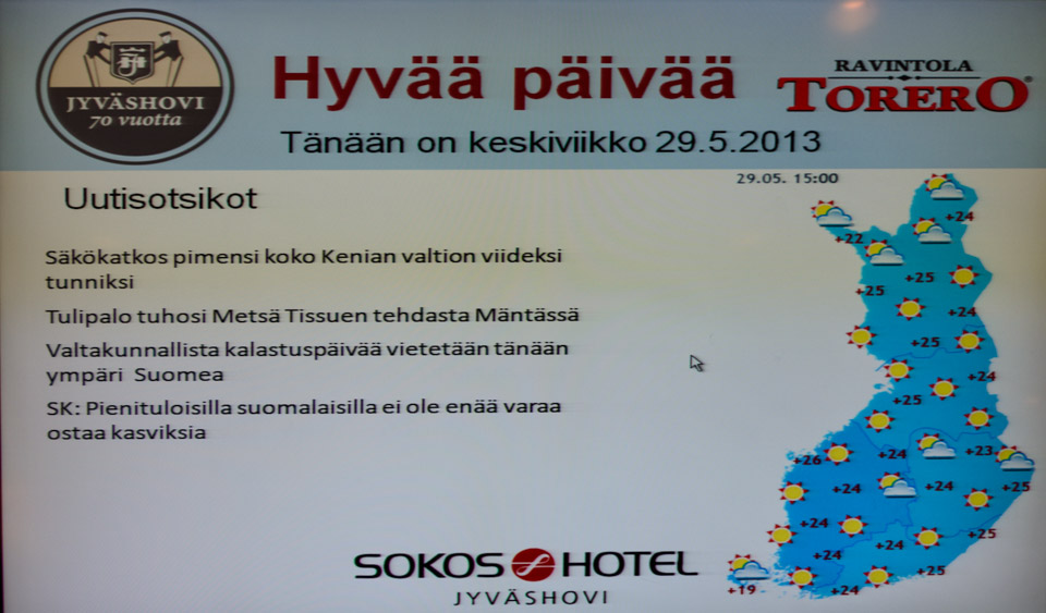 This display in our hotel in Jyväskylä shows the unusually uniform sunny weather and warm temperatures on May 29, 2013, all over Finland, even above the Arctic Circle. 22-26 C is 72-79 F
