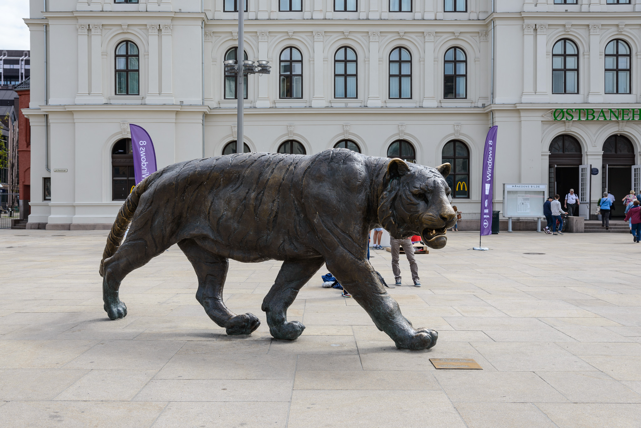 The statue of the tiger commemorates the 1000th birthday of Oslo's founding celebrated in the year 2000. The statue alludes to the town's nickname of Tigerstaden.