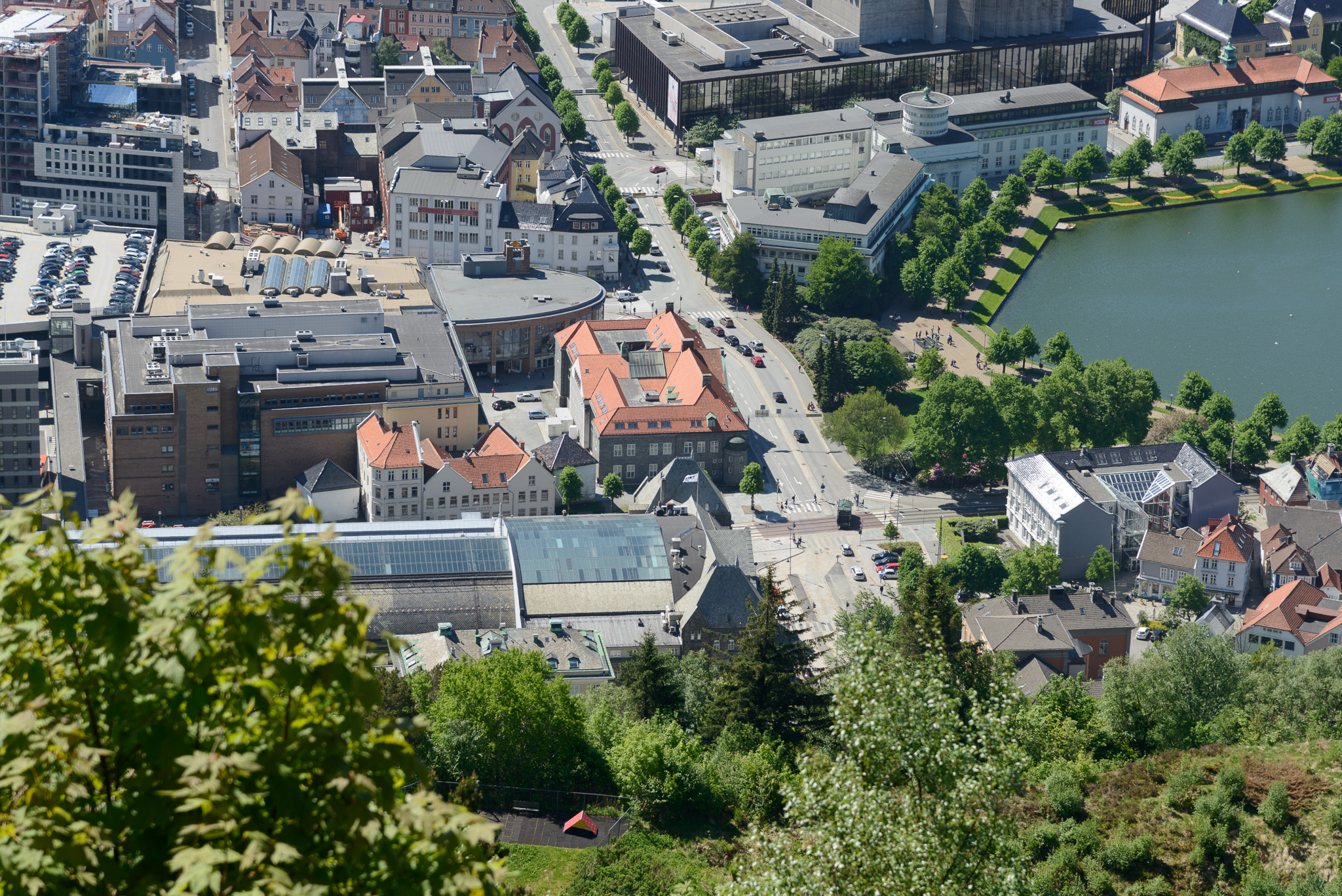 The train station and Grand Hotel Terminus are in the lower left of this photo. The gray, red-roofed building is the library. The building to the upper left from the library is a large indoor shopping mall.