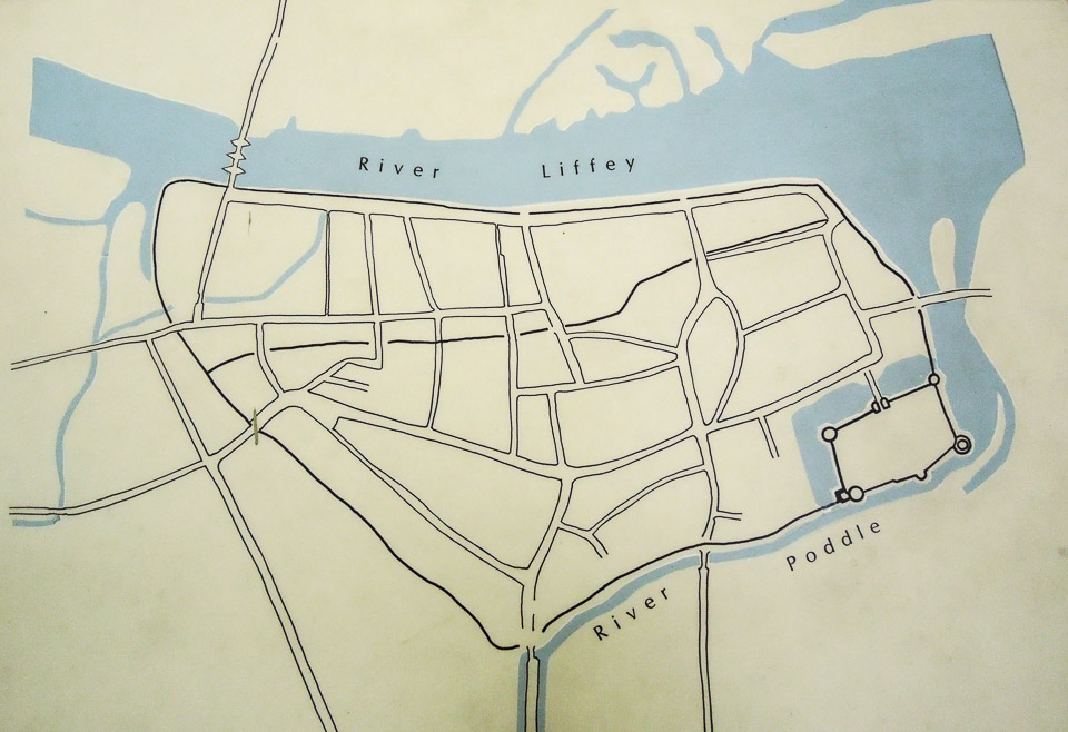 The historic area of the walled city of Dublin with Dublin Castle at the lower right, both walled and surrounded by a moat.