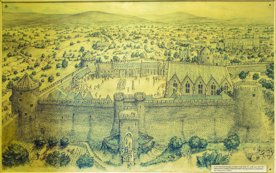 A reconstruction drawing of Dublin Castle from the north, c. 1475 A.D. (Illustration by Stephen Conlin from 'Dublin: One Thousand Years' published by O'Brien Press, Dublin).