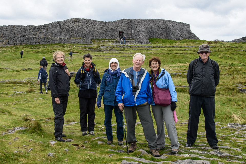Kathy, Chris, Mary Lou, Wes, Gina, and John, with the Dún Aenghus first rampart in the background