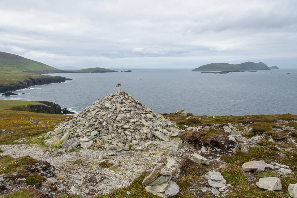 Looking south from Garraun Point, the Blasket Islands are to the right and the Skellig Islands are specks on the horizon near the center of the photo.