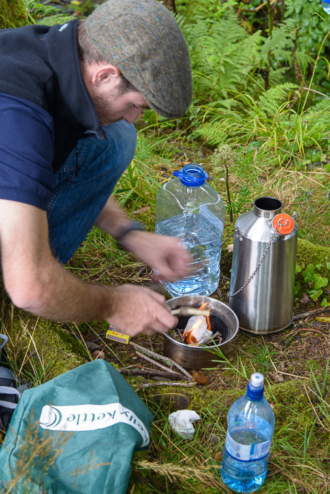 Seán starting a fire in the Kelly Kettle to boil water for coffee