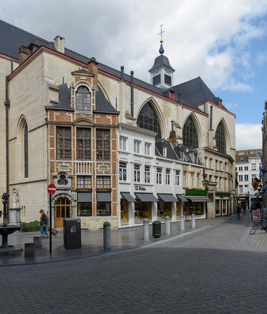 The Saint Nicolas Church is clad on the side by commercial businesses (jewelers) with apartments on the upper floors.